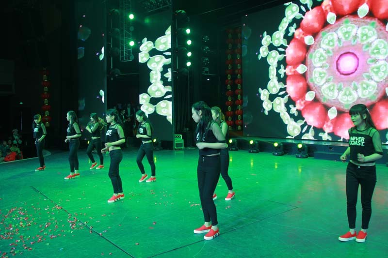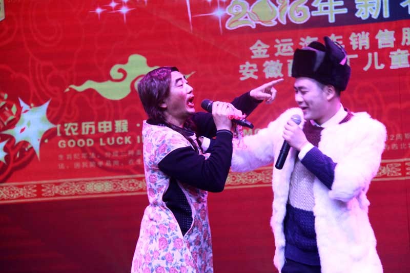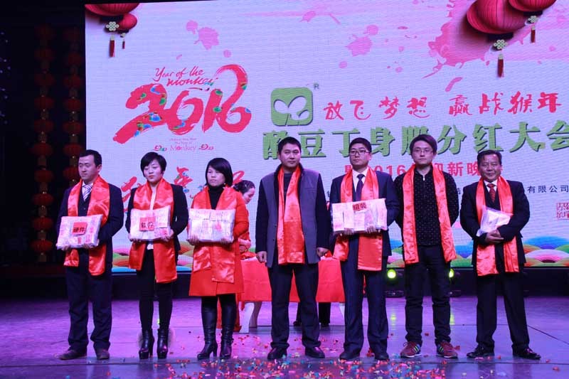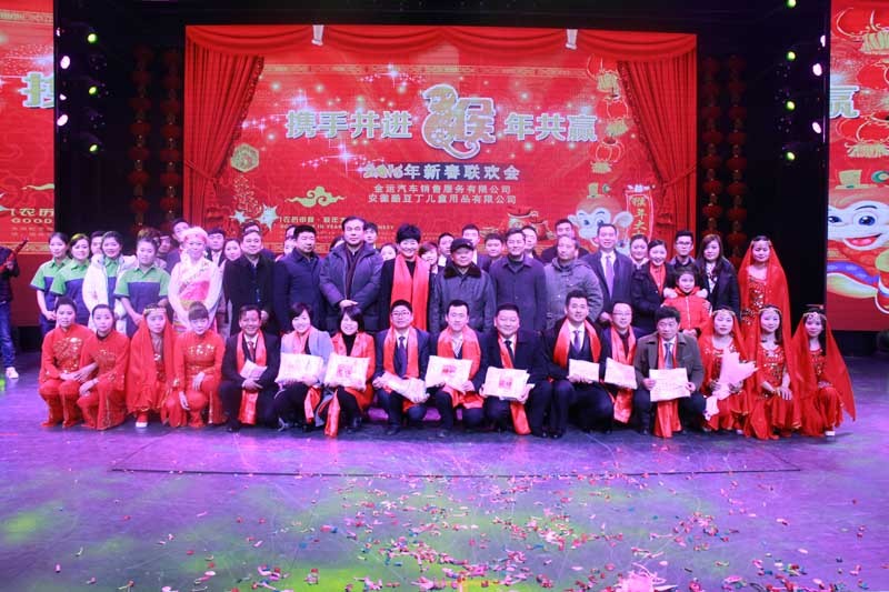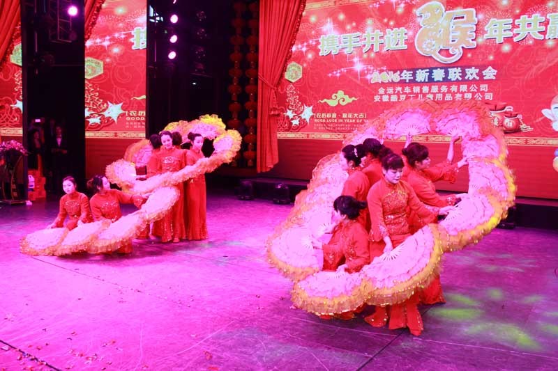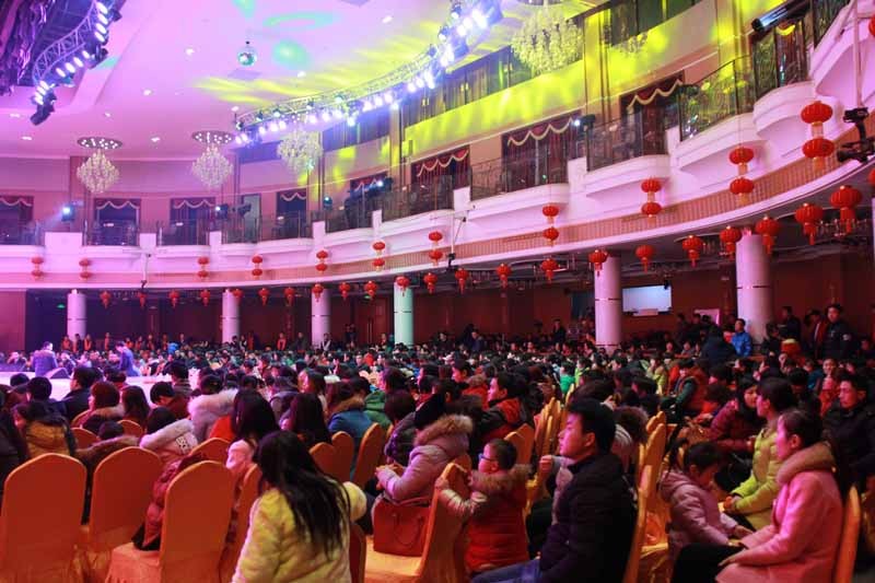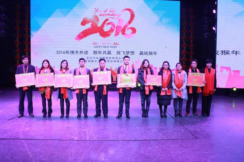 大会举行了2015年身股分红仪式,现场分的现金230万元。分别表彰了33名先进工作者,12名质量标兵、20名技术能手、5名优秀干部、7个先进单位。公司领导分别为获奖者颁发了奖牌和奖金。联欢会上,领导和员工们同台表演了舞蹈、独唱、诗朗诵、小品、走秀、手语舞蹈等丰富多彩的文艺节目。在会场热烈的气氛中,公司还特别开展了诱人的抽奖活动。最后,区领导和公司领导上台与所有演员合影留念。