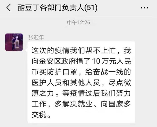 “这次的疫情我们帮不上大忙,我向金安区政府捐赠了10万元人民币买防护口罩,给奋战在一线的医护人员和其它人员,尽点微博之力。等疫情过后我们努力工作,多解决就业,向国家多交税”,这是安徽酷豆丁科技发展股份有限公司党支部书记、董事长张迎年同志在管理层微信群中说的一段话。