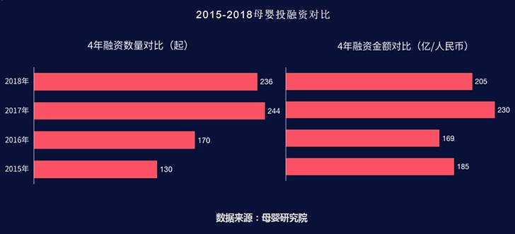 第三是母婴新零售有29起,新零售想象空间巨大,资本层面的融资、并购、上市也在头部玩家中不断发生。此外,孕产儿科医疗领域投融资有23起,母婴内容产业有18起。从统计报告看,2018年母婴行业还是非常热的。和2017年相比,投融资的数量和金额虽然在下降,但并不明显。母婴行业是刚需行业,常青行业,大家不必过多担心大环境的变化。