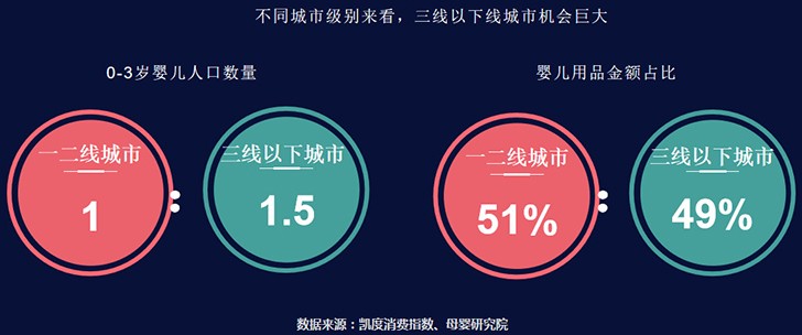 同样纯线上购买的消费者非常少,绝大部分是全渠道购买,同时线上线下购买的人均消费是仅在线下购买的1.2倍。另外,一二线城市和三线以下的城市对比,0~3岁的婴儿人口的数量是1:1.5,可以看三线以下的城市是巨大的金矿,而且婴儿用品的消费金额比几乎是1:1,这是一个巨大的蓝海。