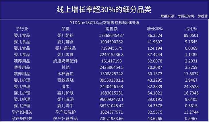 第四,细分为王,大而全、小而美同时并存。母婴子行业规模在不断扩大,很多细分品类增长率是非常高的,其中线上增长超过30%的细分品类非常多,如奶粉、辅食、奶瓶、湿巾等。