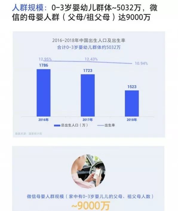 1、人群规模:0-3岁婴幼儿群体~5032万,微信的母婴人群(父母/祖父母)达9000万。