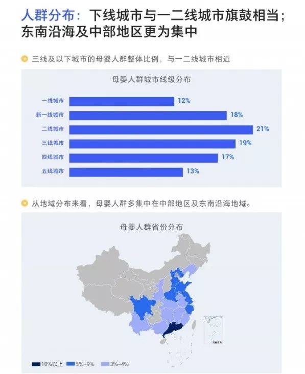 一方面,都市和小镇的母婴人群占比旗鼓相当;另一方面,从中部地区,越往东部沿海,母婴人群的分布越是密集。