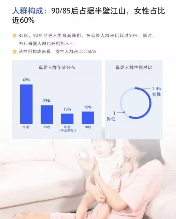 3、人群构成:90/85后占据半壁江山,女性占比近60%。85后、90 后已进入生育高峰期,在母婴人群占比超过50%,同时,95后母婴人群也开始加入。