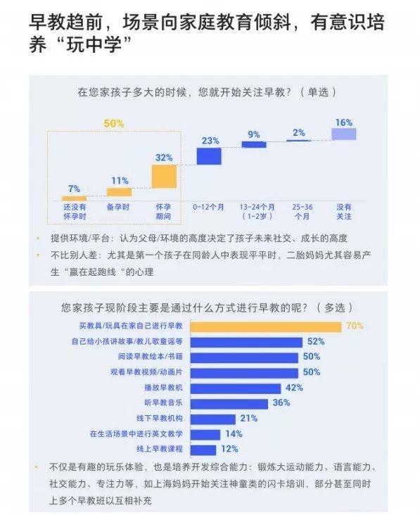 4、对早教较为重视,场景化早教向家庭教育倾斜,有意识培养玩“玩中学”。