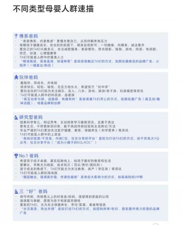 ·育儿方式更多元,爱自己的佛系爸妈、爱玩会玩的玩伴爸妈、专业严谨的研究型爸妈,成才卓越的No.1爸妈、爱家奉献的三“好”爸妈…针对不同细分群体的精准营销尤为重要