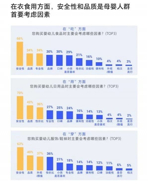 6、在衣食用方面,安全性和品质是母婴人群首要考虑因素