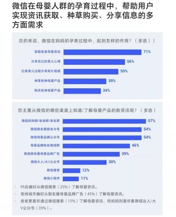 1、微信在母婴人群的孕育过程中,帮助用户实现资讯获取、种草购买、分享信息的多方面需求