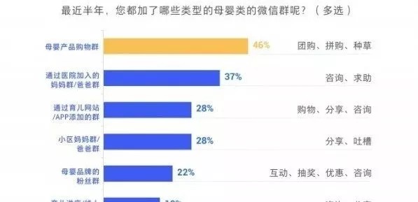 2、微信群是母婴人群获取资讯、社交分享及购买的重要综合阵地