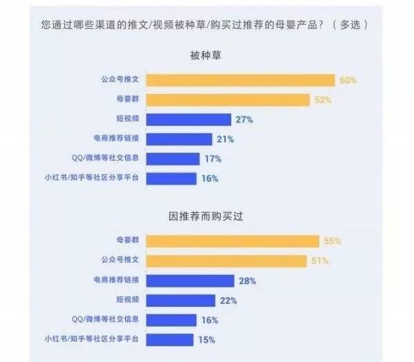 ·80/90后因看微信公众号推文(52%)而购买母婴产品的情况更突出。