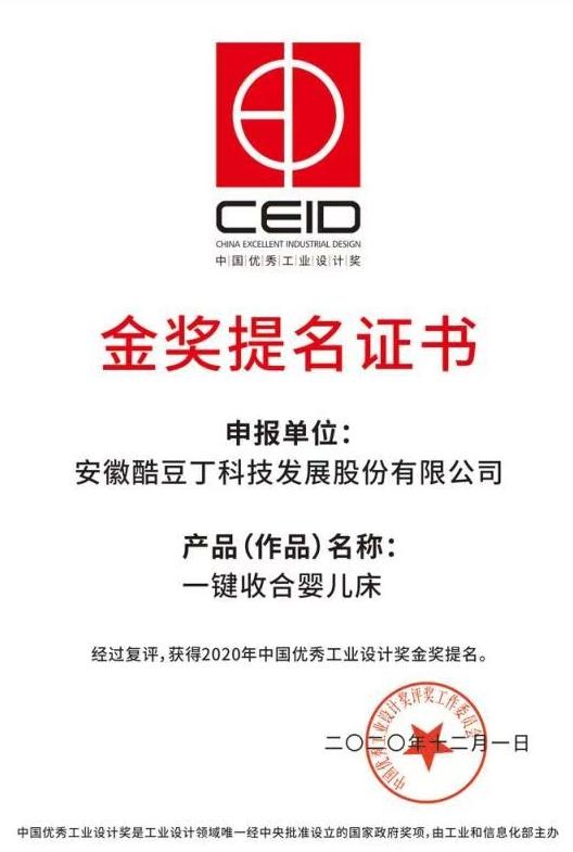 安徽酷豆丁科技发展股份有限公司“派出一键收合婴儿床(P100H)”参加此次中国优秀工业设计奖评选大赛”并“从10000多件作品中脱颖而出,入选金奖终评参展产品,全国共有1016件产品(作品)进入复评名单。酷豆丁在众多优秀产品中脱颖而出并荣获中国优秀工业设计奖金奖提名,作为安徽省内唯二,六安市唯一的企业进入终评,也向全球展现了酷豆丁的实力。