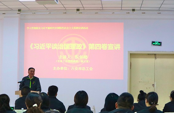 在工会干部宣讲阶段,阮怀楼身穿酷豆丁公司职工工作服上台为大家详细解读了《习近平谈治国理政》第四卷,当天是他在酷豆丁“当一周工人”的最后一天,通过与企业职工共同生活、共同劳动,他的宣讲接地气、深入人心,赢得了广大职工的喝彩。阮怀楼从“为啥学”“学什么”“怎么做”三个方面向我们分享了学习《习近平谈治国理政》第四卷的有关感悟,他强调学习《习近平谈治国理政》第四卷有助于我们进一步加深对“中国之路”、“中国之治”、“中国之理”的理解认识,深入学习贯彻《习近平谈治国理政》第四卷作为当前和今后一个时期的重大政治任务,必须抓紧抓实,将学习第四卷与前三卷贯通起来,与学习贯彻总书记考察安徽讲话的重要指示精神结合起来,切实把学习成果转化为拉高标杆、奋勇争先,立足岗位、建功立业的生动实践。