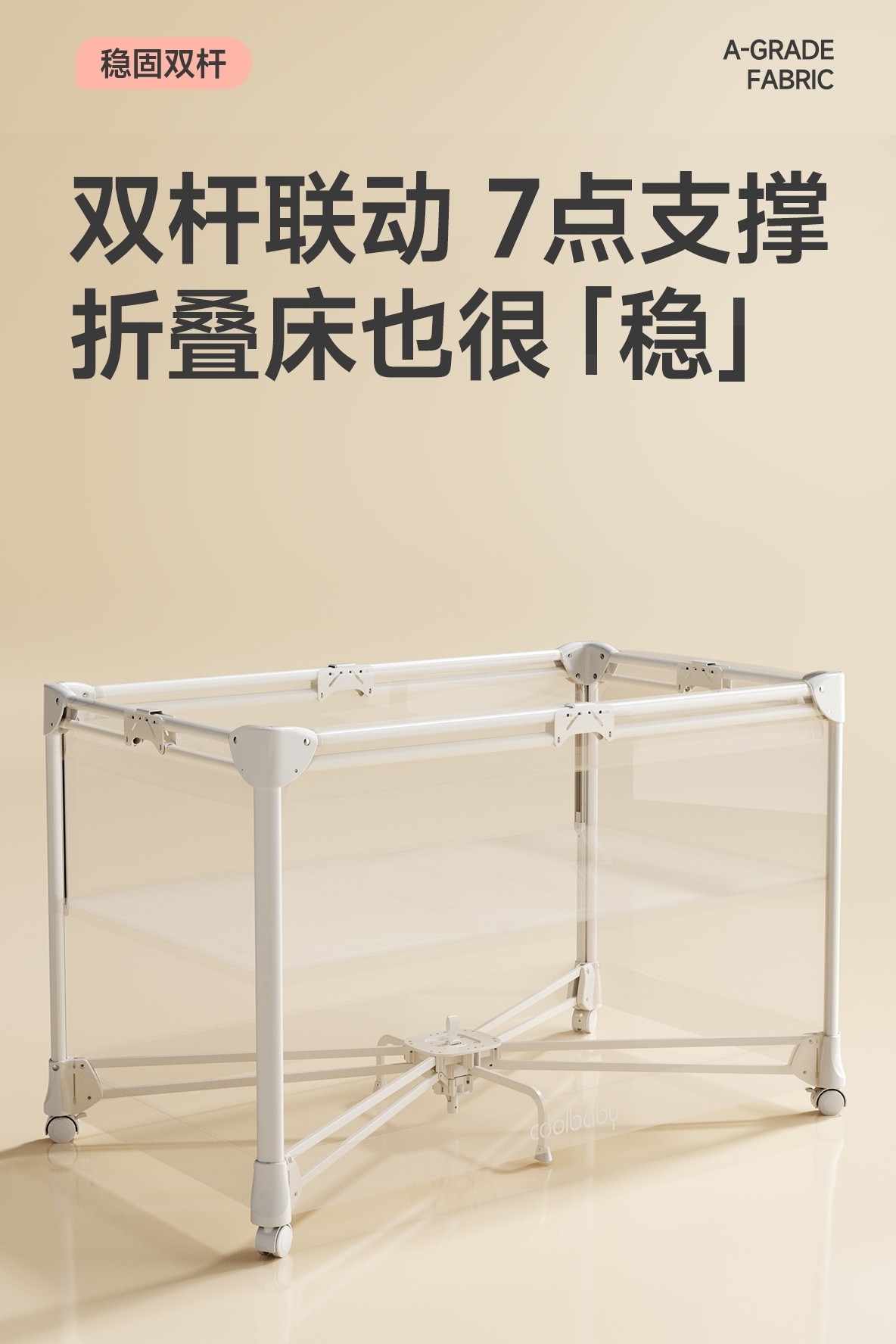 酷豆丁婴儿床拥有一键收折技术,一提即收,一按即开,静音万向轮,随行随动,且铝合金材质相对较轻,在搬运和移动时更加轻便好携带,轻轻松松就可以带出门,解放爸妈双手,守护宝宝童年。