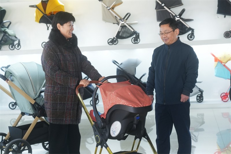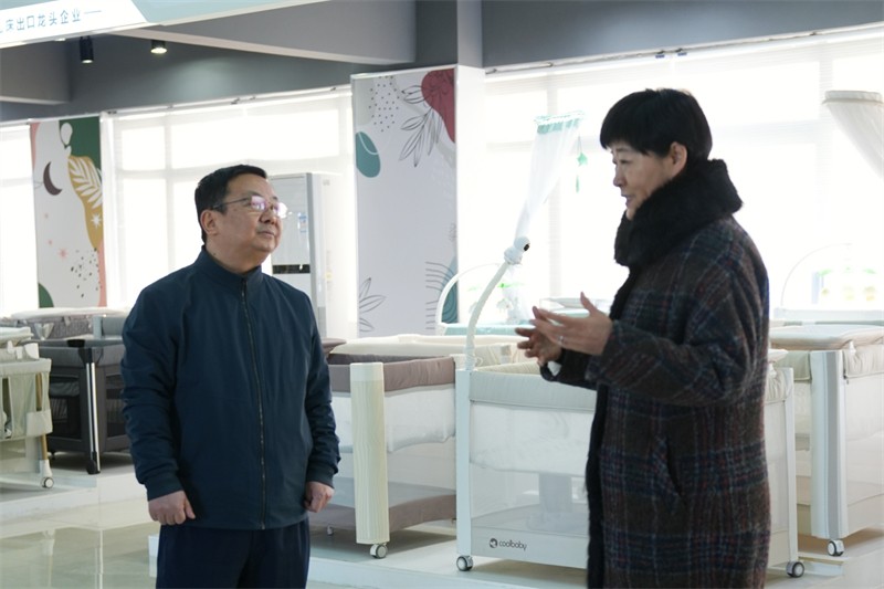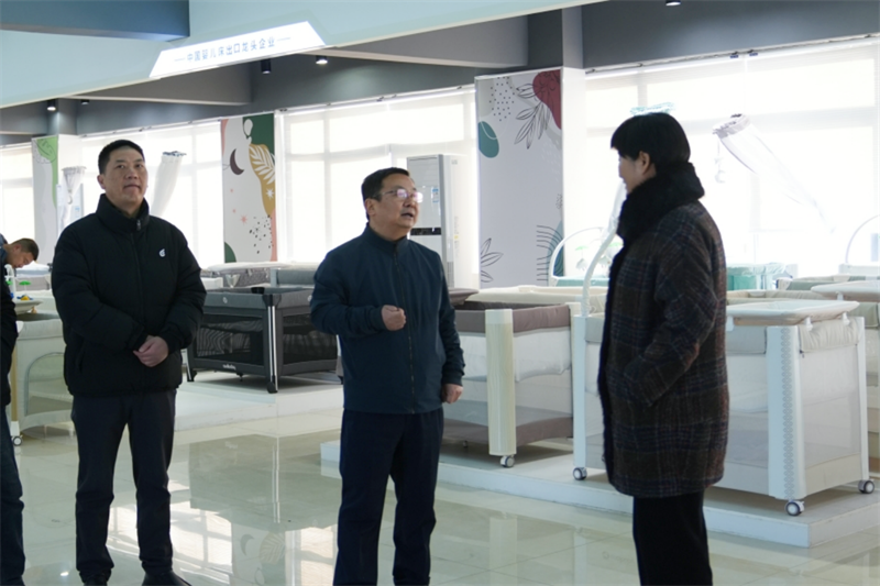 调研期间,李煜副市长一行前往酷豆丁的产品样品间,查看了各类婴童用品展示。在样品间内,董事长张迎年详细介绍了公司产品的核心竞争力、创新亮点以及市场定位等情况。李煜副市长一行认真听取介绍,并不时询问产品在国际市场的销售情况、关税政策对企业的影响以及企业目前面临的困难和挑战等,深入了解企业的发展现状及未来规划。