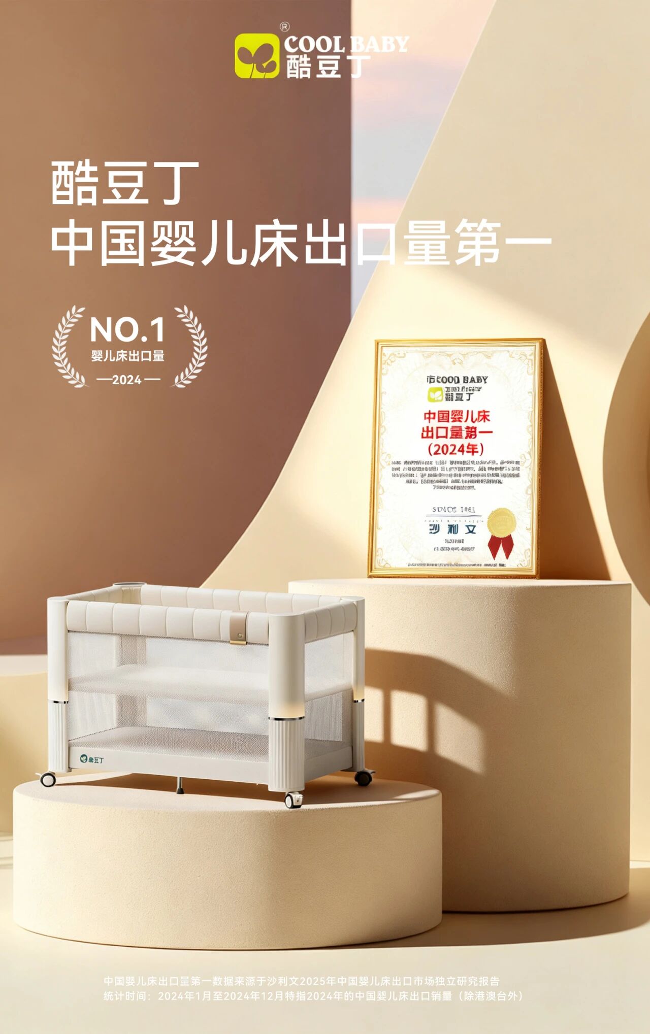 在全球母婴消费升级浪潮下,消费者对产品的安全性、功能性与设计美学需求持续攀升,驱使母婴行业向智能化、环保化、高附加值方向加速发展。在此背景下,2025年,全球权威行业研究与咨询机构弗若斯特沙利文(Frost & Sullivan,以下简称“沙利文”)发布最新调研成果,基于对中国内地(不包含港澳台地区)婴儿床市场的研究,宣布安徽酷豆丁科技发展股份有限公司荣获“2024年中国婴儿床出口量第一”企业的市场地位声明。